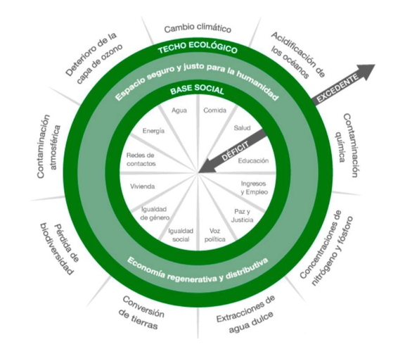 En abril de 2020, durante la primera oleada de COVID-19, el gobierno de la ciudad de Amsterdam anunció que se recuperaría de la crisis y evitaría otras futuras al adoptar la teoría del «modelo económico de la rosquilla” (o la Doughnut Economics). Explicada por la economista británica Kate Raworth en un libro de 2017, esta teoría sostiene que el pensamiento económico del siglo XX no está equipado para lidiar con la realidad del siglo XXI de un planeta que se tambalea al borde del colapso climático. En lugar de equiparar un PIB en crecimiento con una sociedad exitosa, nuestro objetivo debería ser el de encajar toda la vida humana en lo que Raworth llama el «punto óptimo» entre la «base social», donde todos tienen lo que necesitan para vivir una buena vida, y el «techo ambiental». En general, la gente de los países ricos vive por encima del techo ambiental. Los de los países más pobres a menudo quedan por debajo de la base social.